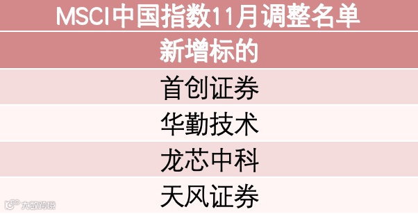 具体来看,MSCI中国指数本次新增4只标的,包括首创证券、华勤技术、龙芯中科、天风证券。