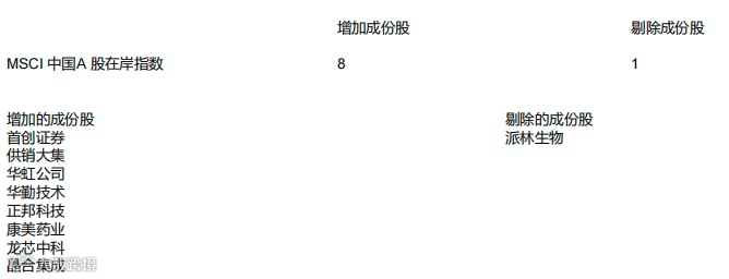 除MSCI中国指数以外,MSCI中国A股在岸指数的成分股名单也有所调整,其中增加成分股8只,包括首创证券、供销大集、华虹公司、华勤技术、正邦科技、康美药业、龙芯中科、晶合集成,剔除了派林生物。不过,跟踪MSCI中国A股指数的海外资金相对较少,调整或不会带来显著的资金进出。