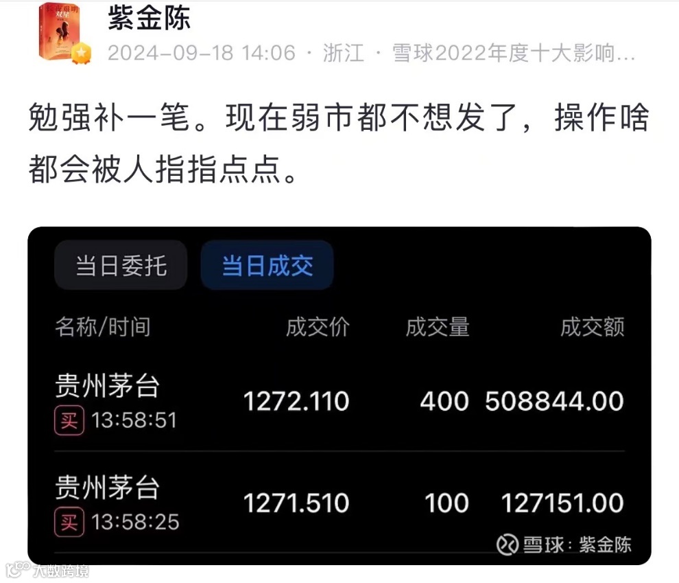 在茅台股价创下阶段性新低之际,茅台的拥护者依旧坚定看多。18日下午,知名作家紫金陈晒出自己的补仓,加仓了两笔贵州茅台,合计约63.6万元。他表示,目前茅台持仓浮亏约20%。