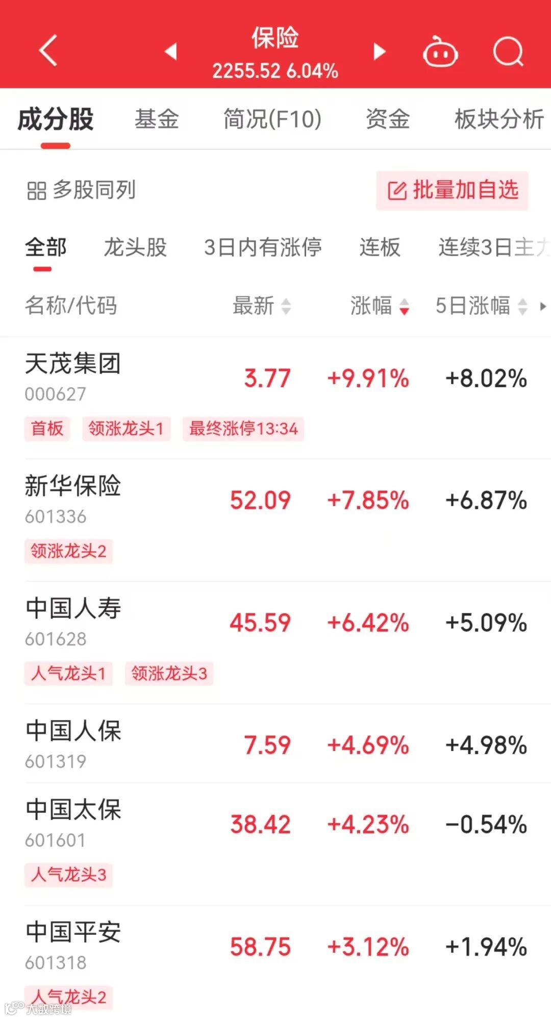 今天,大金融板块持续发力,保险股集体上涨,同花顺保险板块涨幅超6%。天茂集团涨停,新华保险、中国人寿、中国人保等跟涨。