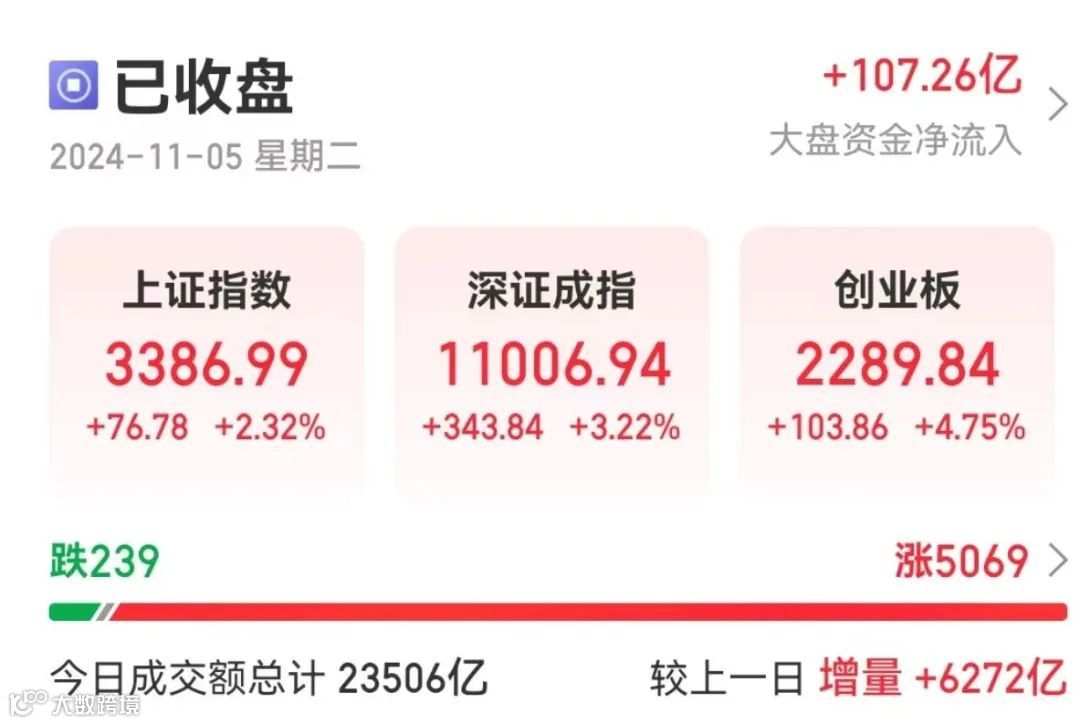 截至收盘,沪指涨2.32%,深成指涨3.22%,创业板指涨4.75%。全天全市场超5000只个股上涨。沪深北三市全天成交额超2.35万亿元,较上个交易日放量6272亿元。