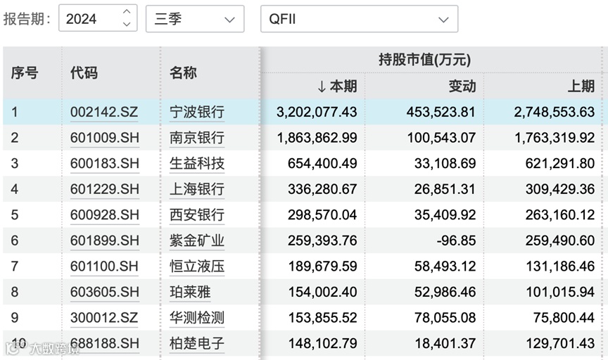 2024年三季报披露收官,机构持股最新动向随之浮出水面。QFII持仓市值高于中报披露的水平;