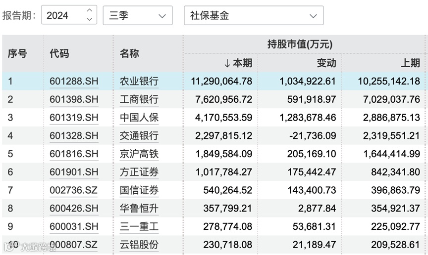 。Wind数据显示,截至三季度末,社保基金共出现在563家上市公司的前十大流通股东中,共有377股获社保基金持仓过亿元,占比为66.96%。