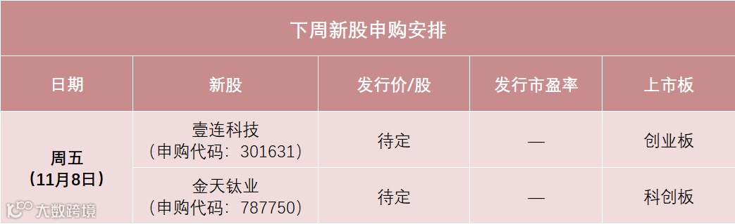 根据目前发行安排,下周有2只新股申购,时间均在下周五(11月8日),分别是创业板新股壹连科技、科创板新股金天钛业。