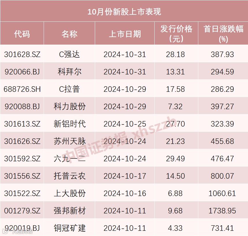 Wind数据显示,10月共有11只新股上市,上市首日的收盘平均涨幅达632.06%。其中,深市主板新股强邦新材、创业板新股上大股份,上市首日收盘涨幅都超过了10倍,分别为1738.95%、1060.61%。