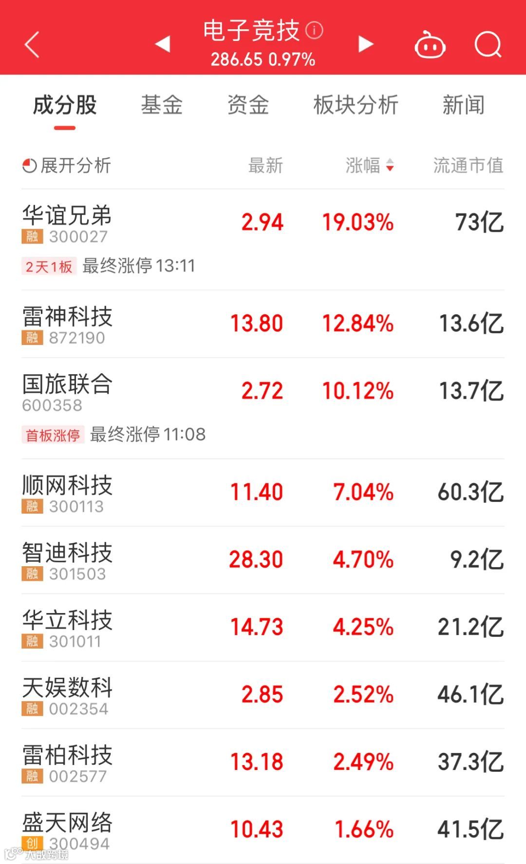 截至收盘,电子竞技板块涨幅居板块涨幅榜第二位。华谊兄弟大涨超19%,盘中一度涨停;雷神科技涨超12%,盘中一度涨超18%。
