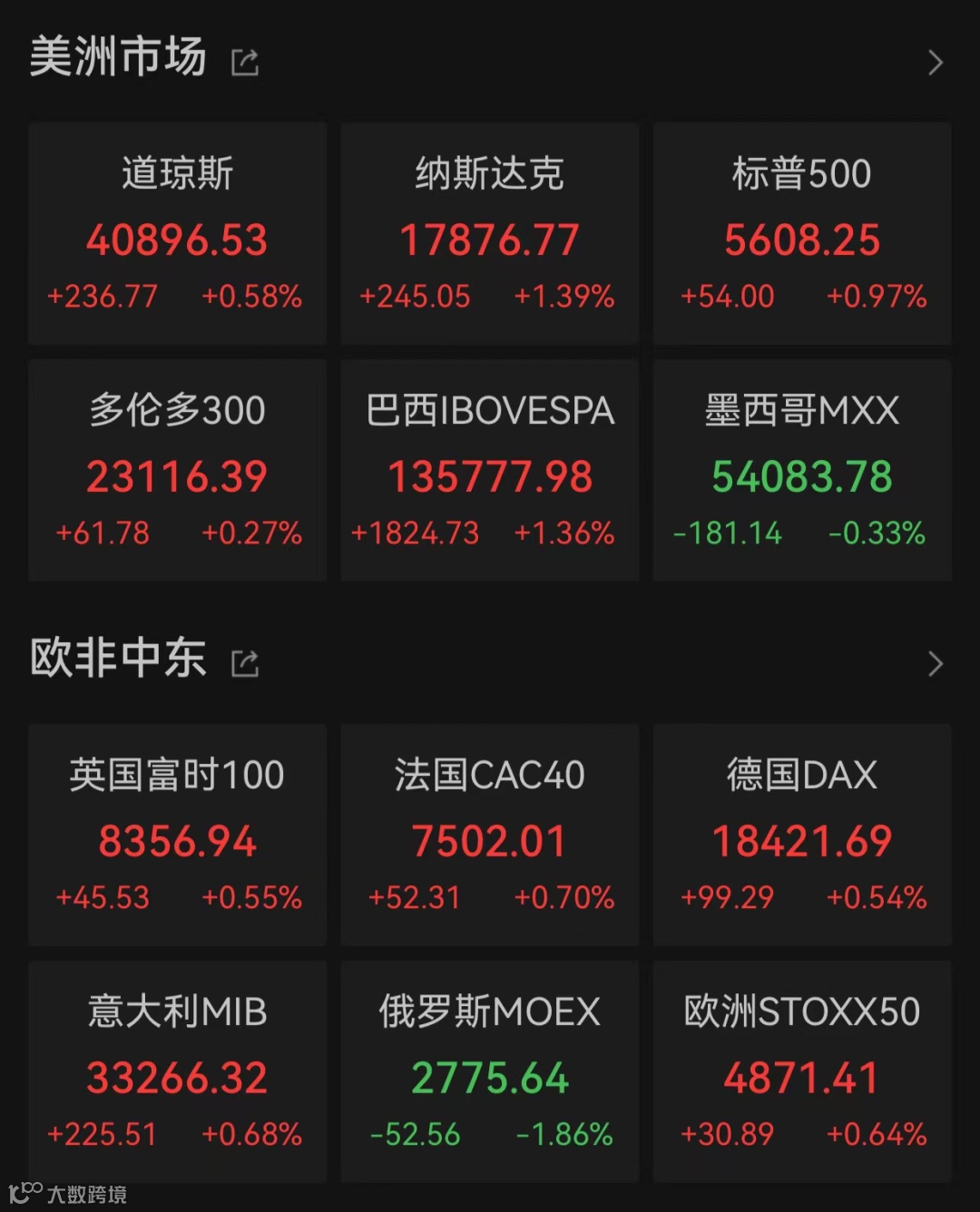 截至收盘,道琼斯工业指数、纳斯达克指数、标普500指数分别上涨0.58%、1.39%、0.97%,道琼斯工业指数连续5个交易日上涨,纳斯达克指数与标普500指数均连续8个交易日上涨。