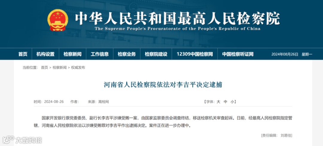最高人民检察院8月26日消息,国家开发银行原党委委员、副行长李吉平涉嫌受贿一案,由国家监察委员会调查终结,移送检察机关审查起诉。日前,经最高人民检察院指定管辖,河南省人民检察院依法以涉嫌受贿罪对李吉平作出逮捕决定。案件正在进一步办理中。