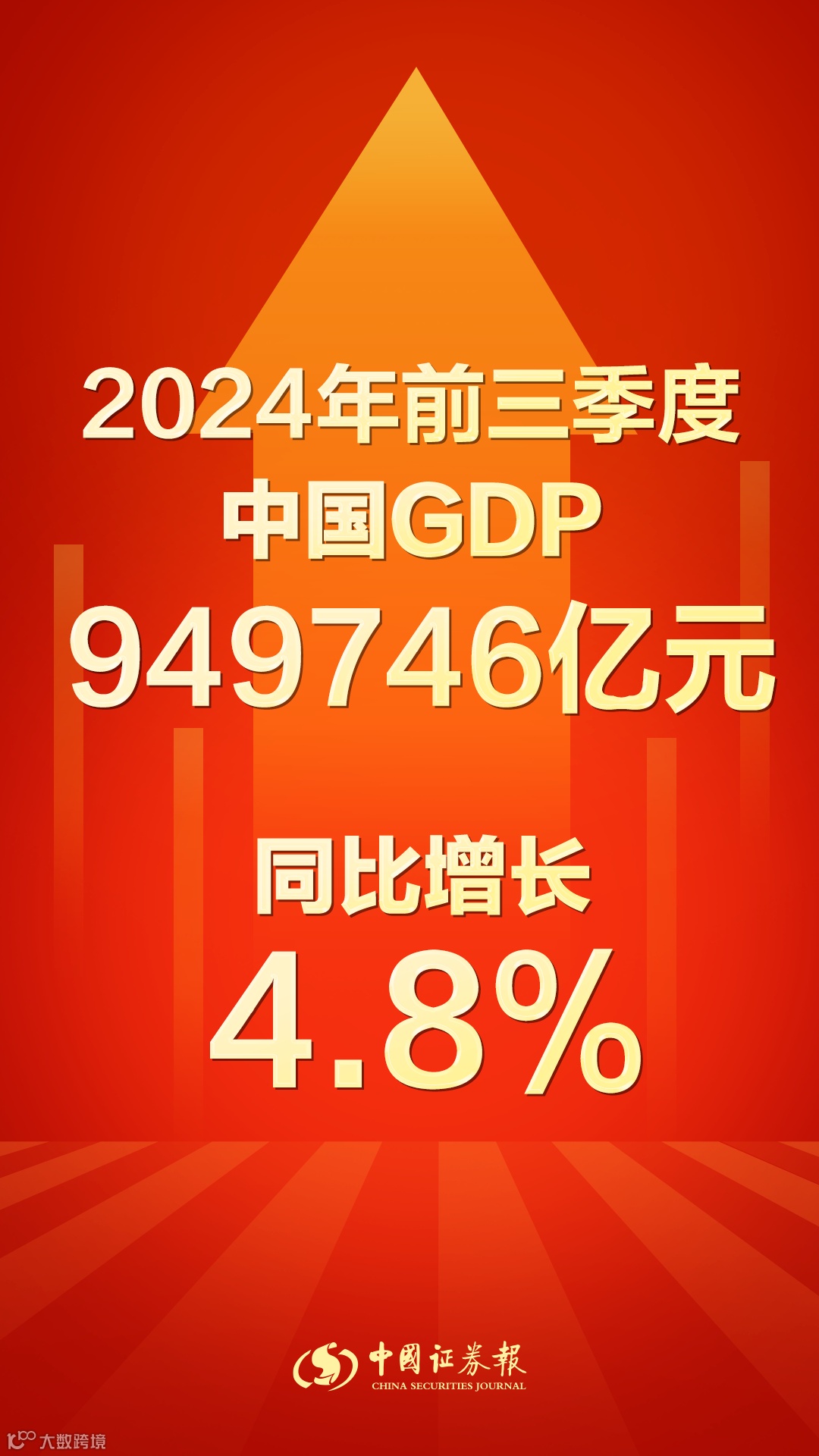 国家统计局10月18日发布数据显示,初步核算,前三季度国内生产总值949746亿元,按不变价格计算,同比增长4.8%。分产业看,第一产业增加值57733亿元,同比增长3.4%;第二产业增加值361362亿元,增长5.4%;第三产业增加值530651亿元,增长4.7%。分季度看,一季度国内生产总值同比增长5.3%,二季度增长4.7%,三季度增长4.6%。从环比看,三季度国内生产总值增长0.9%。