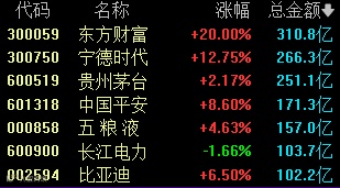 今天上午出现7只个股成交额超100亿元的场景。东方财富上午成交额最大,为310.8亿元。