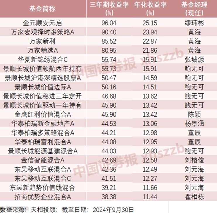 其中,金元顺安元启灵活配置混合、万家宏观择时多策略A、万家新利、万家精选A近三年收益率超过80%。