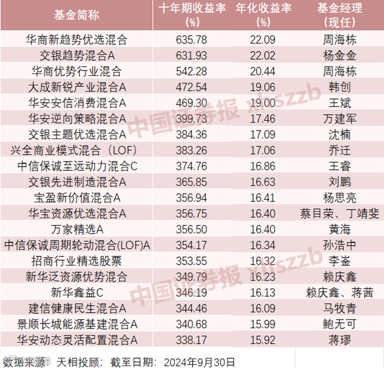 华商新趋势优选混合近十年收益率最高,达635.78%,十年年化收益率达22.09%;