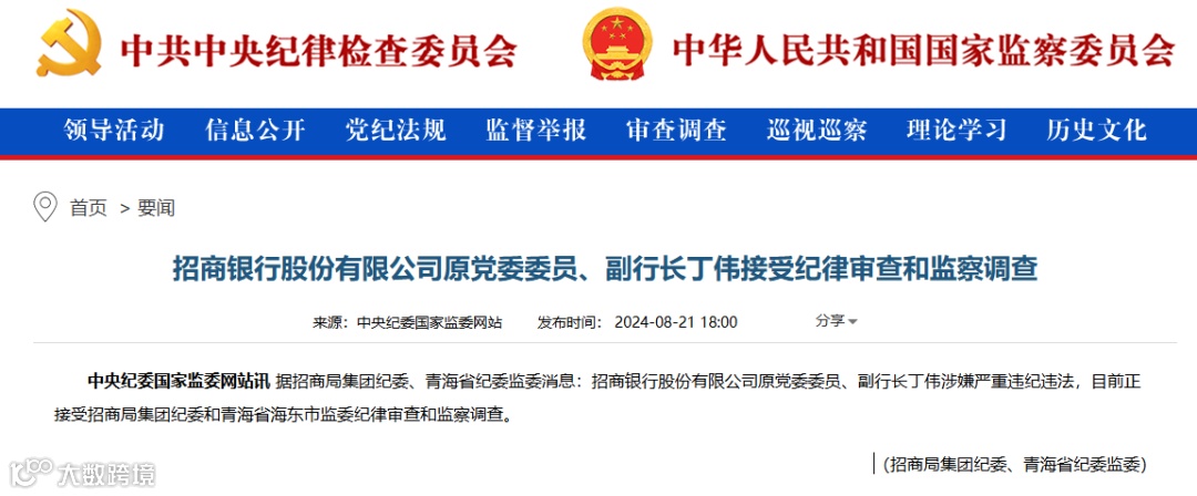 8月21日,中央纪委国家监委网站公布,据招商局集团纪委、青海省纪委监委消息,招商银行股份有限公司原党委委员、副行长丁伟涉嫌严重违纪违法,目前正接受招商局集团纪委和青海省