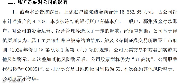 公告称,本次被冻结的银行账户有基本户、一般户、募集资金存款账户,对公司的资金运营、经营管理等造成一定影响,经慎重判断,ST高鸿基于谨慎原则认为,属于主要银行账户被冻结的情形触及《深圳证券交易所股票上市规则(2024年修订)》相关规定,公司股票交易将被叠加实施其他风险警示。