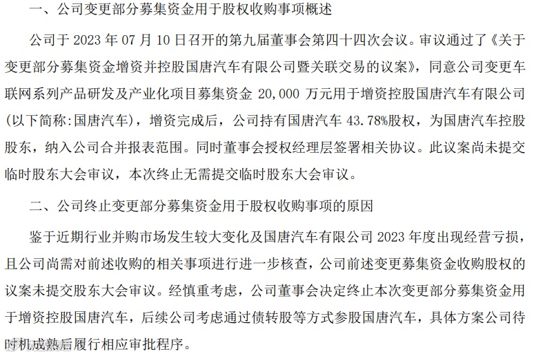 对于终止原因,公告解释称,鉴于近期行业并购市场发生较大变化及国唐汽车有限公司2023年度出现经营亏损,且公司尚需对收购的相关事项进行进一步核查,公司前述变更募集资金收购股权的议案未提交股东大会审议。经慎重考虑,公司董事会决定终止本次变更部分募集资金用于增资控股国唐汽车,后续公司考虑通过债转股等方式参股国唐汽车,具体方案公司待时机成熟后履行相应审批程序。