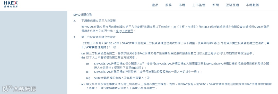 此次,联交所还修订特殊目的收购公司(SPAC)进行SPAC并购交易的独立第三方投资规定。