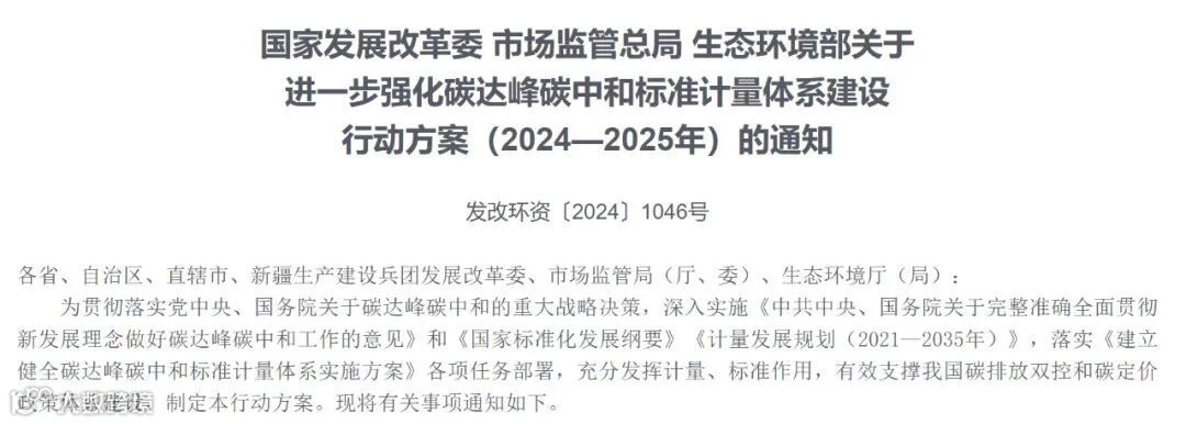 国家发展改革委网站8月8日消息,国家发展改革委、市场监管总局、生态环境部发布《关于进一步强化碳达峰碳中和标准计量体系建设行动方案(2024—2025年)的通知》,旨在充分发挥计量、标准作用,有效支撑我国碳排放双控和碳定价政策体系建设。