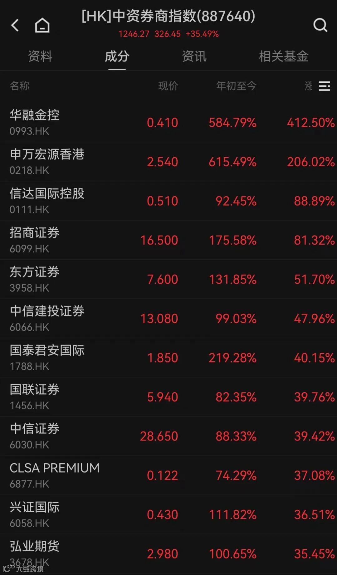 “牛市旗手”券商股今日表现抢眼,中资券商指数盘中创出历史新高。从个股看,华融金控暴涨412.50%;申万宏源香港大涨206.02%,盘中创出6年多以来新高,年内累计涨幅突破600%;信达国际控股、招商证券、东方证券、中信建投证券、国泰君安国际、国联证券等涨幅居前。