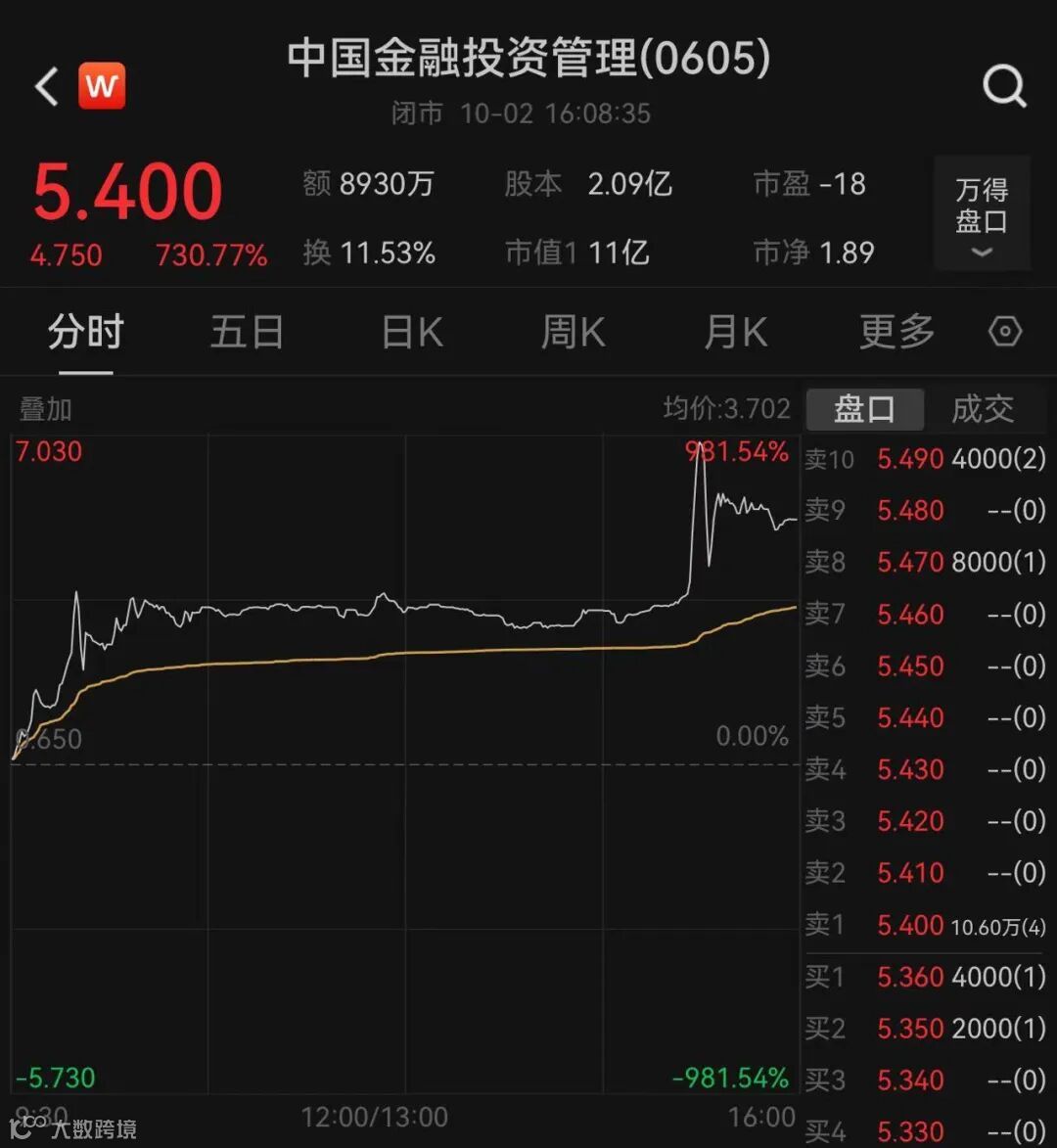 尾盘15时20分,中国金融投资管理突然直线拉升,涨幅突破980%,收涨730.77%,成交额近9000万港元。