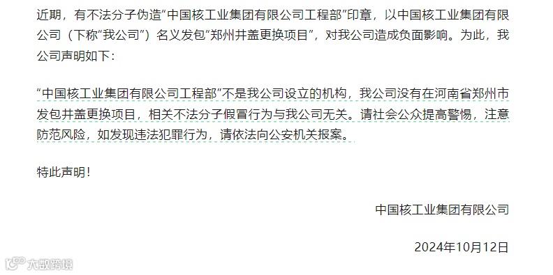 中核集团日前发布《关于不法分子假冒中核集团有关情况的声明》称,