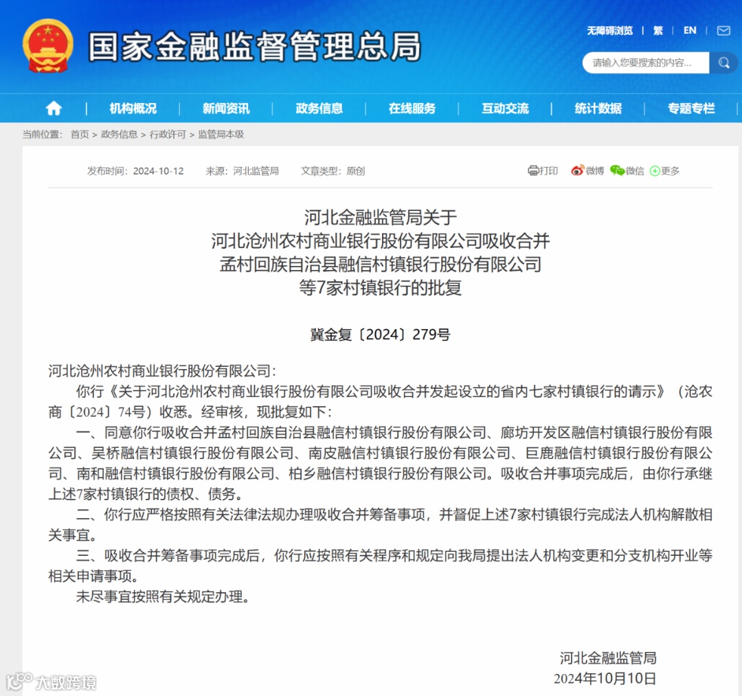 10月12日,国家金融监督管理总局网站披露,河北金融监管局同意河北沧州农商银行吸收合并孟村回族自治县融信村镇银行股份有限公司、廊坊开发区融信村镇银行股份有限公司、吴桥融信村镇银行股份有限公司、南皮融信村镇银行股份有限公司、巨鹿融信村镇银行股份有限公司、南和融信村镇银行股份有限公司、柏乡融信村镇银行股份有限公司。