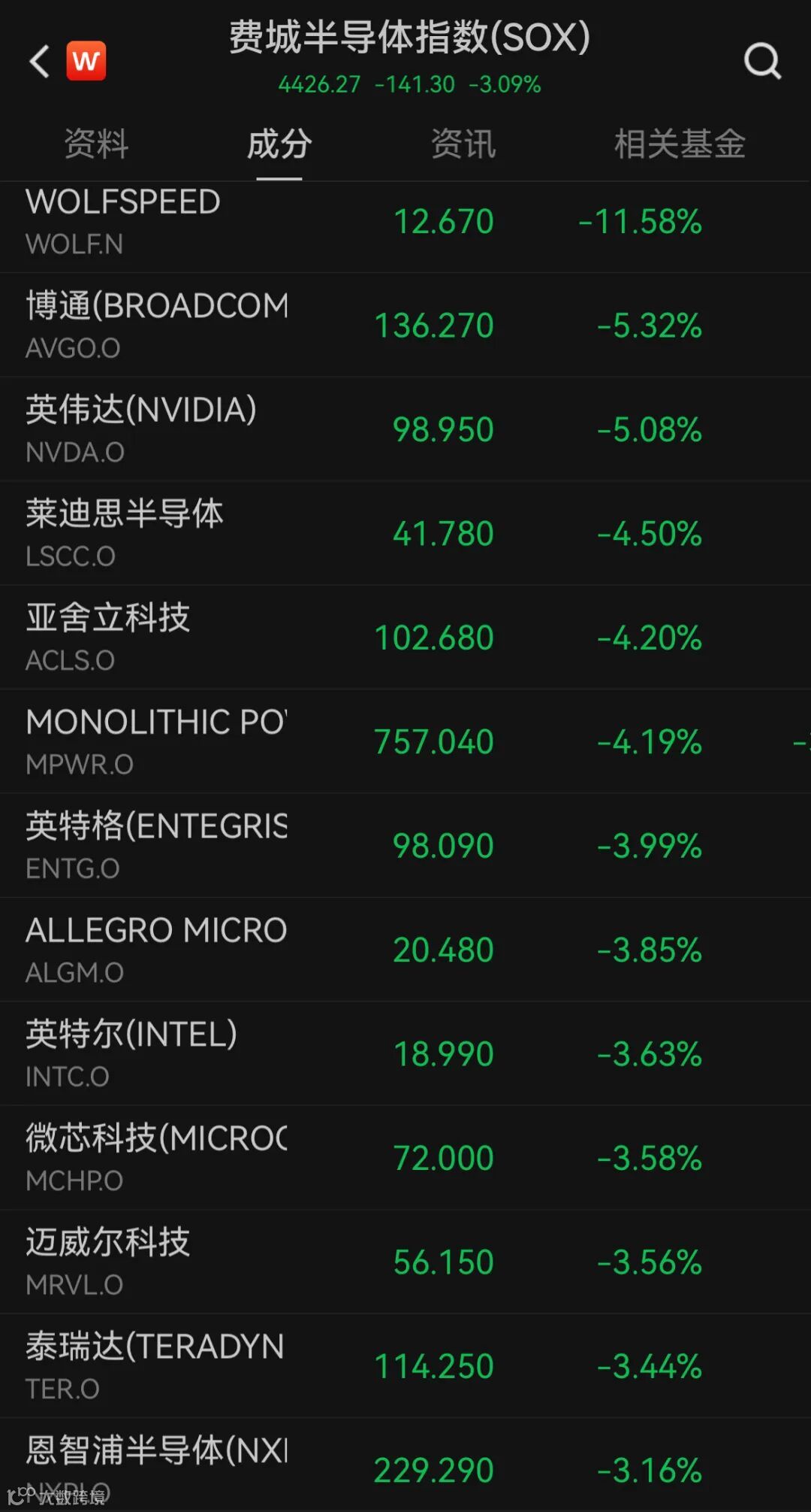 半导体概念股普遍收跌,超微电脑收跌20.14%,Wolfspeed跌超11.5%。费城半导体指数跌超3%。