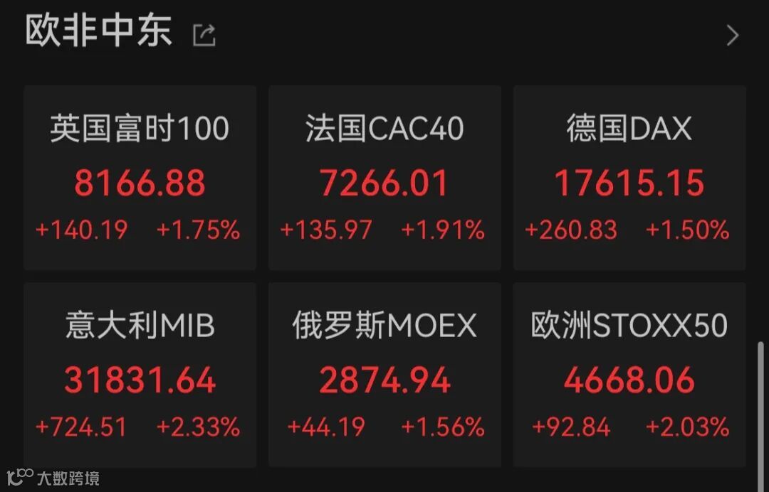 DAX指数涨1.5%报17615.15点,法国CAC40指数涨1.91%报7266.01点,英国富时100指数涨1.75%报8166.88点。