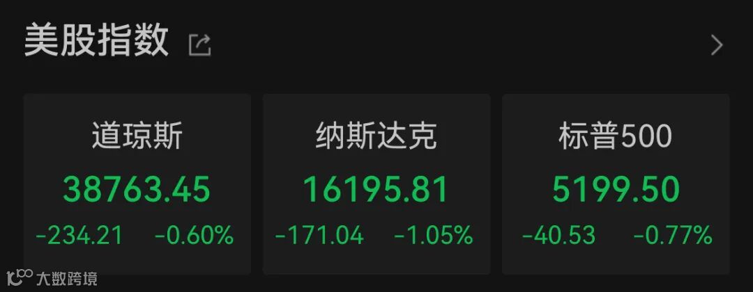 Wind数据显示,截至收盘,道指跌0.6%报38763.45点,标普500指数跌0.77%报5199.5点,纳指跌1.05%报16195.81点。