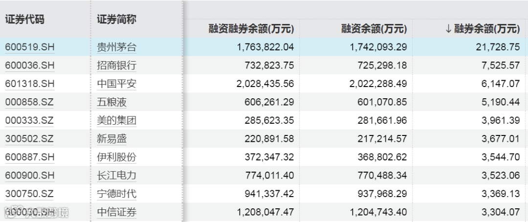 Wind数据显示,截至10月8日,A股市场融券余额居前的股票分别为贵州茅台、招商银行、中国平安,融券余额分别为2.17亿元、0.75亿元、0.61亿元。