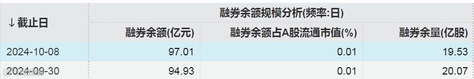 Wind数据显示,截至10月8日,A股市场融券余额为97.01亿元,8日融券余额增加2.08亿元,融券余量为19.53亿股。值得注意的是,8日融券余量减少0.54亿股,为连续14周减少。