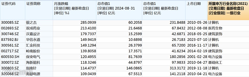涨幅最大的银之杰9月累计涨285.09%,总市值从60.21亿元增长至231.85亿元,期间出现7次“20CM”涨停。