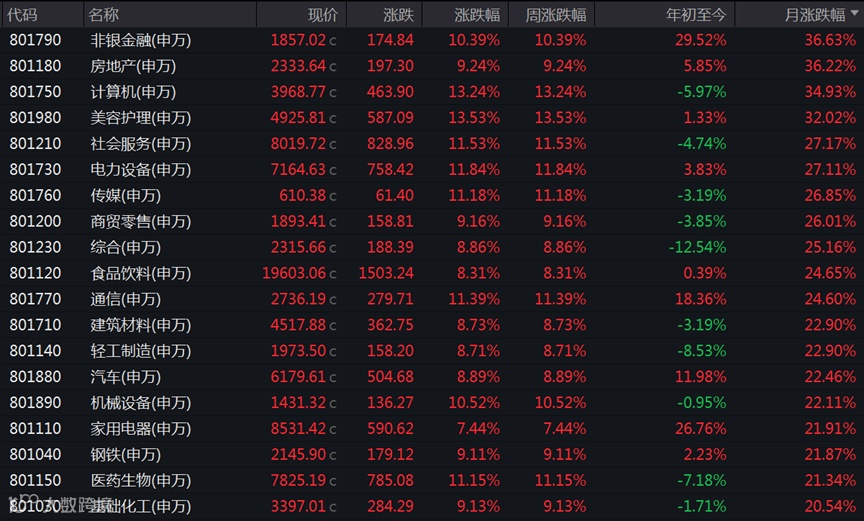 9月,申万一级31个行业全线大涨,非银金融、房地产、计算机行业涨幅居前,分别上涨36.63%、36.22%、34.93%;