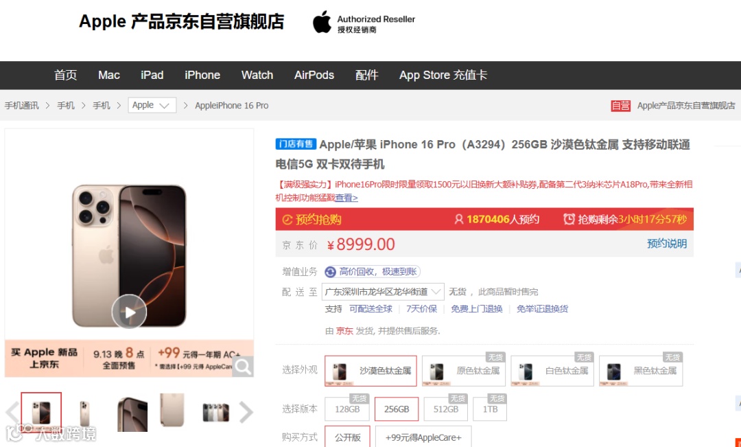 自营旗舰店,截至9月13日晚8点20分,有超过32万人预约iPhone 16和iPhone 16 Plus,这两款机型货源充足;有超过187万人预约iPhone 16 Pro和iPhone 16 Pro Max,但多个版本显示无货。