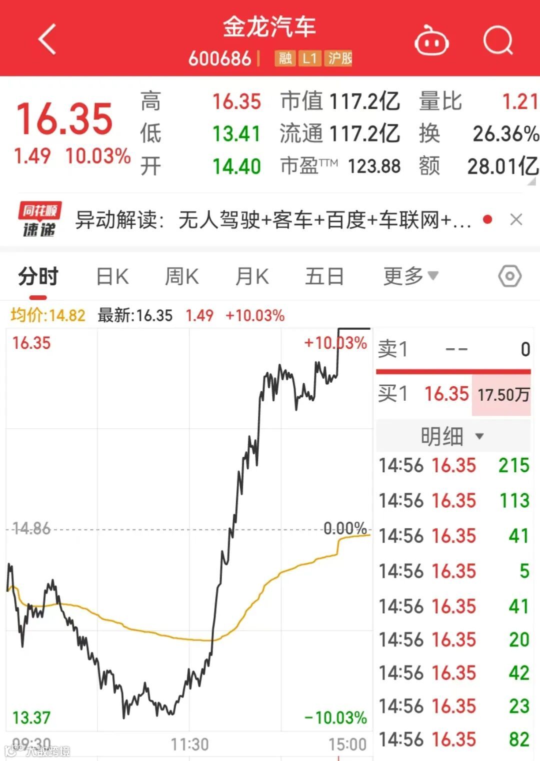 今天,汽车股午后回升,智能驾驶概念股金龙汽车尾盘14点40分涨停,上演准“地天板”,成交金额超26亿元,该股早盘一度逼近跌停。截至收盘,