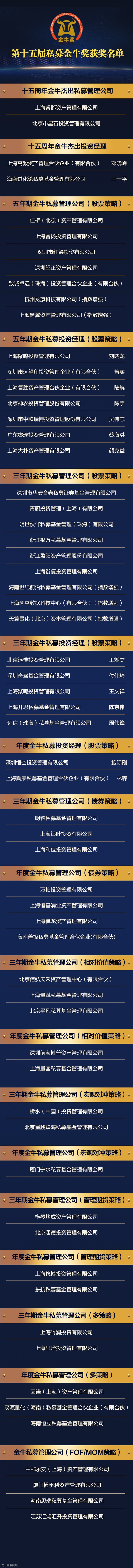 凭借在各方面的优异表现,仁桥资产、睿扬投资、红筹投资、望正资产等7家私募机构荣获 “五年期金牛私募管理公司(股票策略)” 奖项;聚鸣投资的刘晓龙、远望角投资的曾实、复胜资产的陆航等7人荣获“五年期金牛私募投资经理(股票策略)” 奖项。此外,“股票策略”“债券策略” “相对价值策略”“宏观对冲策略”“管理期货策略” “多策略”“FOF/MOM策略”等金牛私募管理公司和投资经理获奖名单同时公布。