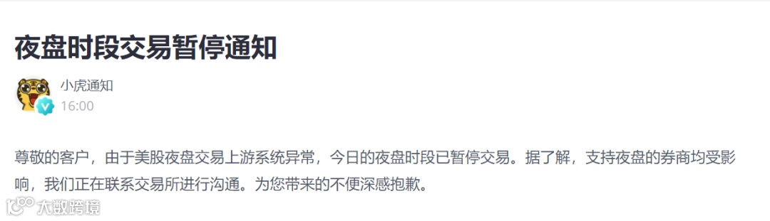 老虎证券也向投资者发文称:“由于美股夜盘交易所系统异常,今日的夜盘时段已暂停交易。据了解,支持夜盘的券商均受影响。我们正在联系交易所进行沟通。为您带来的不便深感抱歉。”