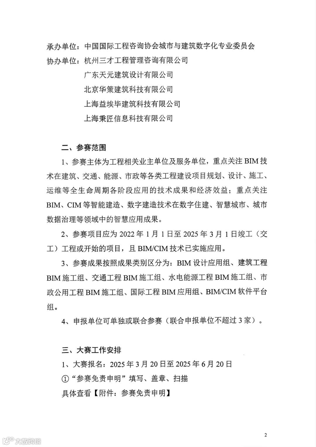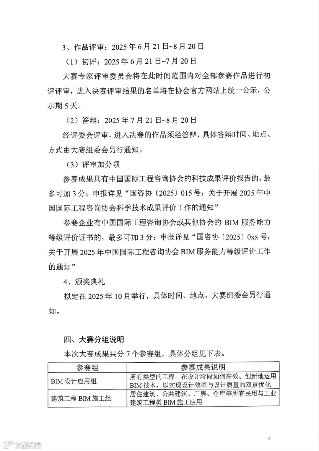 参赛企业有中国国际工程咨询协会或其他协会的BIM服务能力等级评价证书的,最多可加3分;申报详见“国咨协〔2025〕0xx号:关于开展2025年中国国际工程咨询协会BIM服务能力等级评价工作的通知”