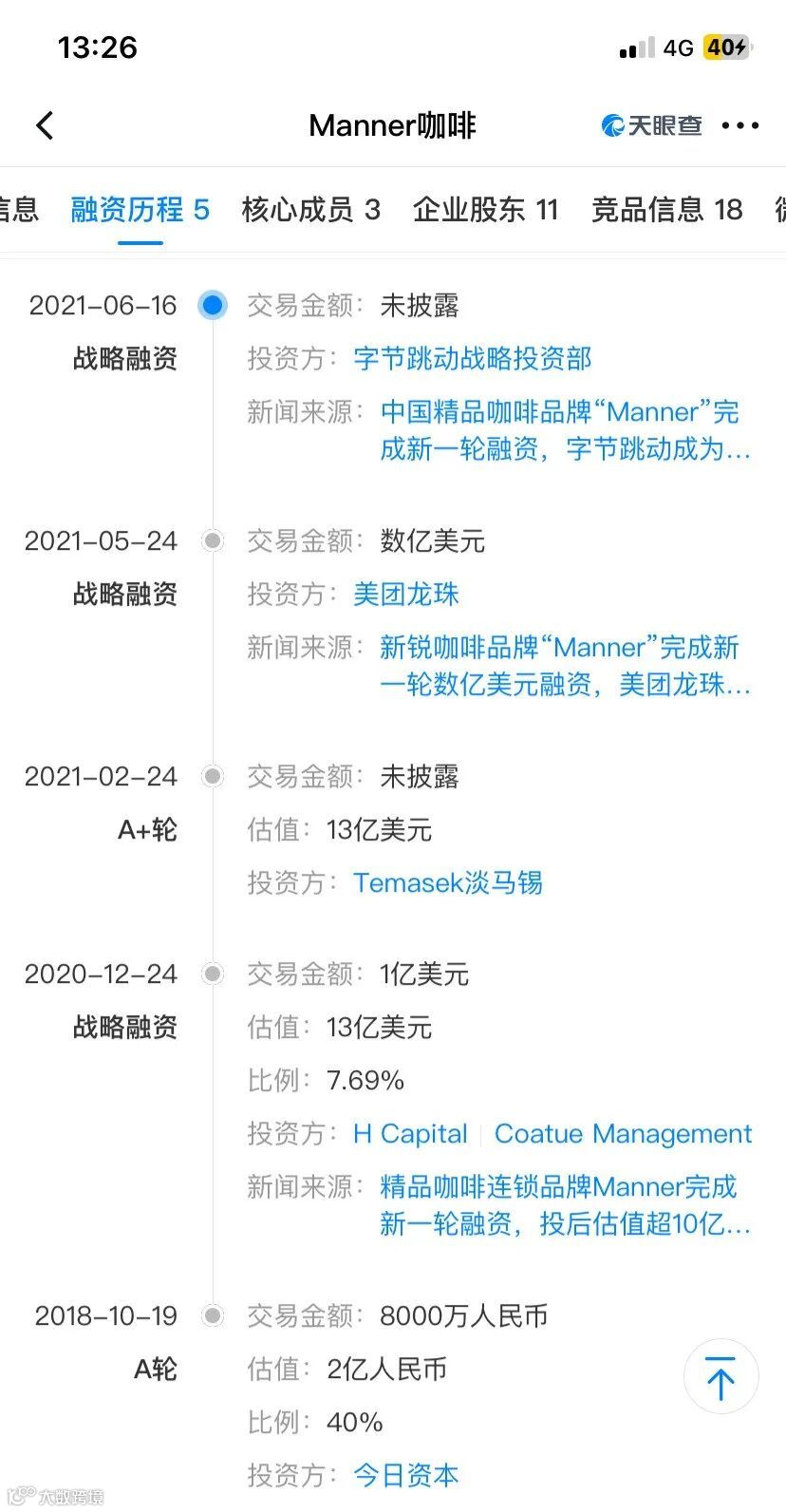 2018年至2021年,新消费赛道融资火热,继今日资本的8000万元融资后,MANNER又先后拿到H Capital、淡马锡、美团龙珠与字节跳动等巨头的投资。