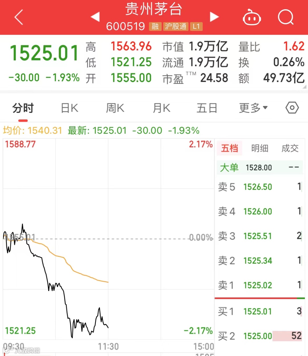 今天上午,“股王”贵州茅台下跌1.93%,股价再创年内新低。