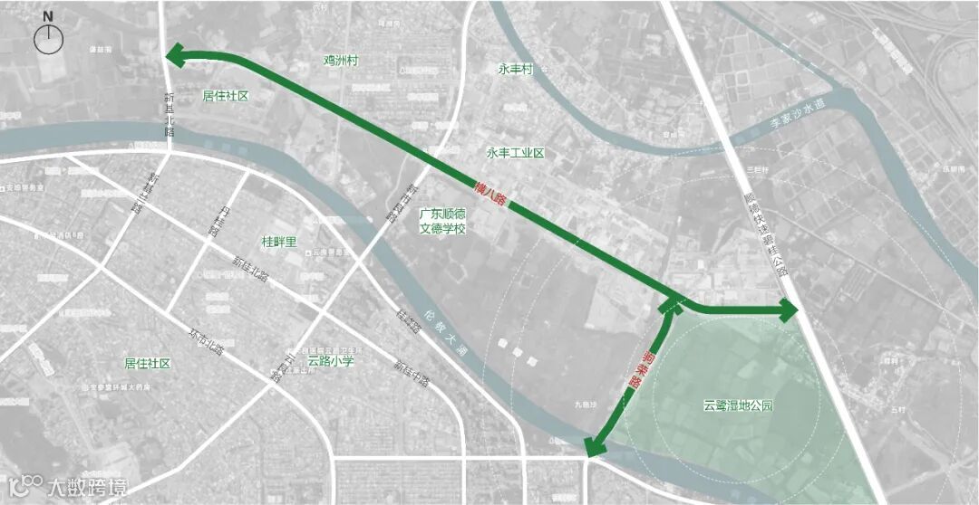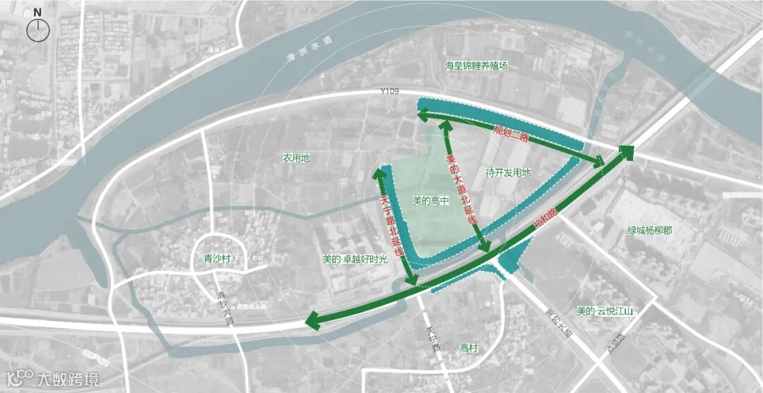 作为华东师范大学第二附属中学美的学校周边形象示范段,项目范围包括学校以西、裕和路以北的河涌景观,美的大道北延线路段、裕和路靠近高中一侧路段景观,美的大道十字路口绿化、河堤绿化的景观提升。设计以“生态绿廊 · 绿美印记”为主题,通过提升河道景观、更新绿化空间、梳理慢行系统、换新城市家具等设计策略,围绕高中校园打造现代都市感城市干道,彰显城市绿美形象,为师生留下美好时光印记。