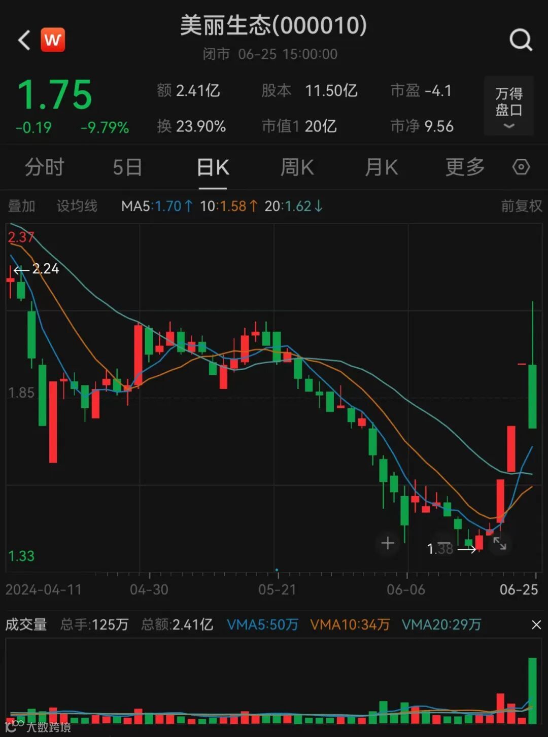 6月25日,美丽生态股价遭遇“天地板”。截至当天收盘,美丽生态股价报1.75元/股,市值仅20亿元。