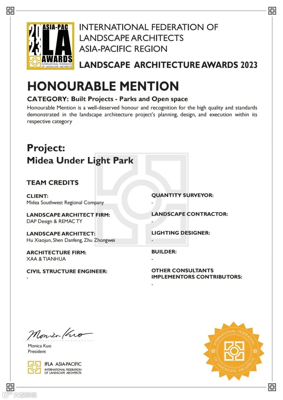 近日,IFLA亚太地区风景园林奖正式公布2023年评选结果公布,本届共有433份参赛作品,睿住天元联合大普设计项目【美的悦然时光公园】凭借以自然艺术回应城市变迁设计理念脱颖而出,荣获公园与开放空间荣誉奖 。