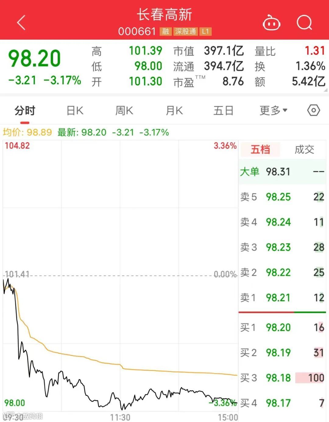 6月20日,长春高新股价跳水,跌破百元,截至收盘报98.20元/股,跌超3%。
