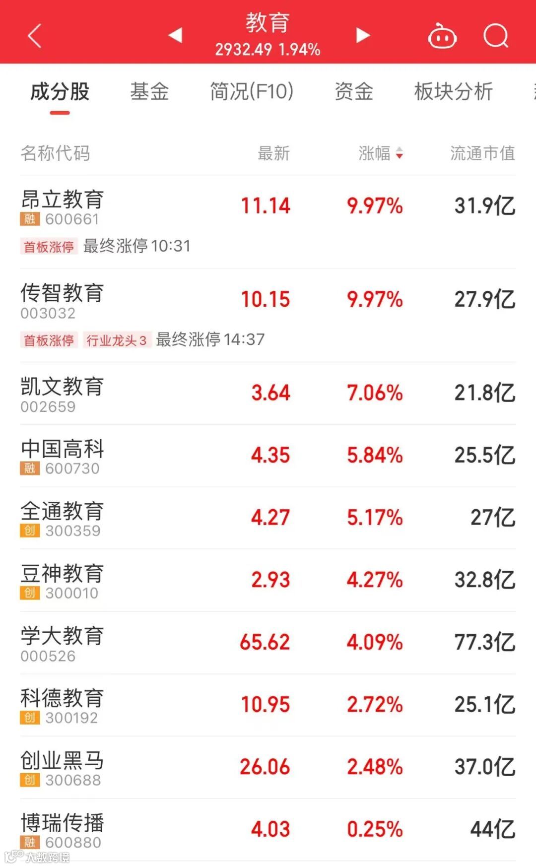 临近尾盘,教育板块突然大力拉升。昂立教育、传智教育涨停,凯文教育、中国高科、豆神教育、学大教育等跟涨。