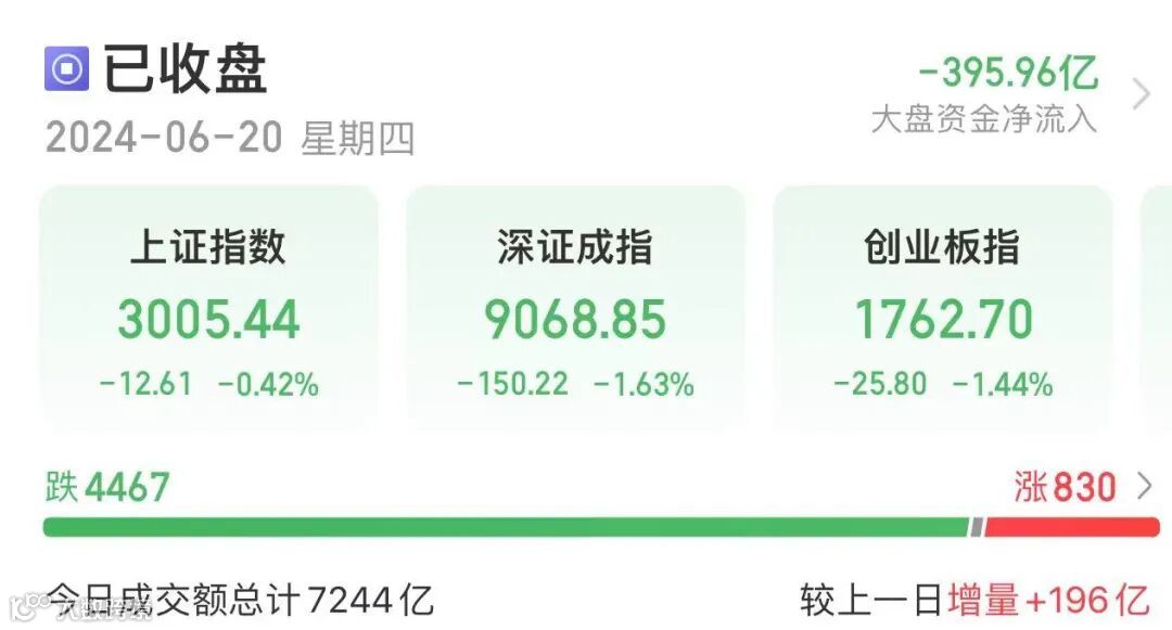 今日,A股三大指数集体走弱。截至收盘,上证指数跌0.42%,深证成指跌1.63%,创业板指跌1.44%。