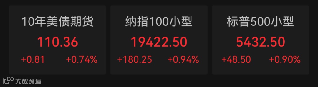截至21时20分,10年美债期货涨0.74%,标普500小型期货涨0.90%,纳指100小型期货涨0.94%。