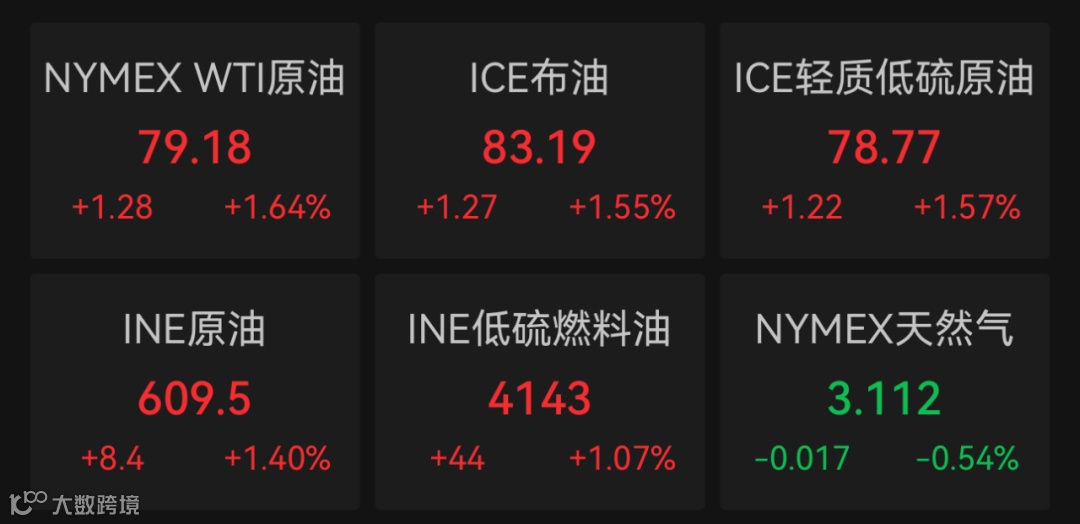 WTI原油涨1.64%,报79.18美元/桶。布伦特原油涨1.55%,报83.19美元/桶。