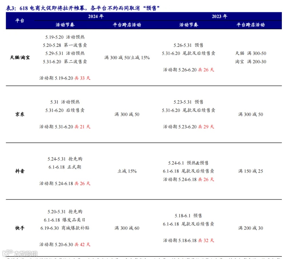 活动机制方面,开源证券分析称,2024年四大电商平台均无预售环节,一方面简化流程让大促活动对消费者更加友好,有望提升消费者体验、促进消费,但另一方面也对商家运营能力提出较大考验。