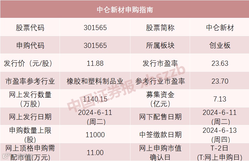 中仑新材的发行价为11.88元/股,发行市盈率为23.63倍,参考行业市盈率为23.7倍。