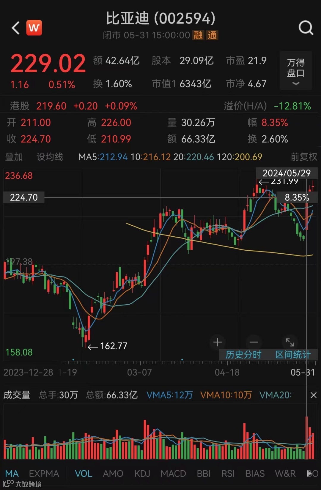 比亚迪股价自2月低点以来,已累计上涨近41%,最新报收229.02元/股,最新市值达6343亿元。